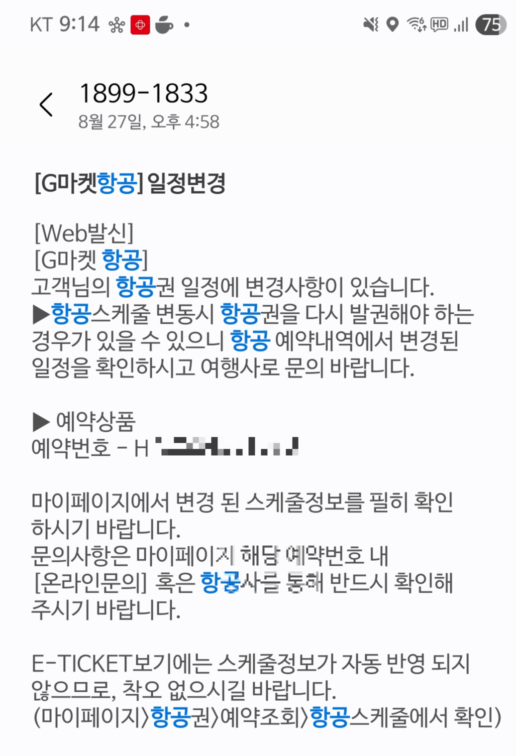 항공사 사정으로 예약한 항공편의 일정이 변경되었다는 알림입니다. 바로 이때, 항공사 고객센터에 직접 연락하여 "항공사 사정으로 스케줄이 변경되었으니, 추가 비용 없이 동일 날짜의 다른 항공편(직항)으로 변경해달라"고 요청했고, 성공적으로 변경할 수 있었습니다.