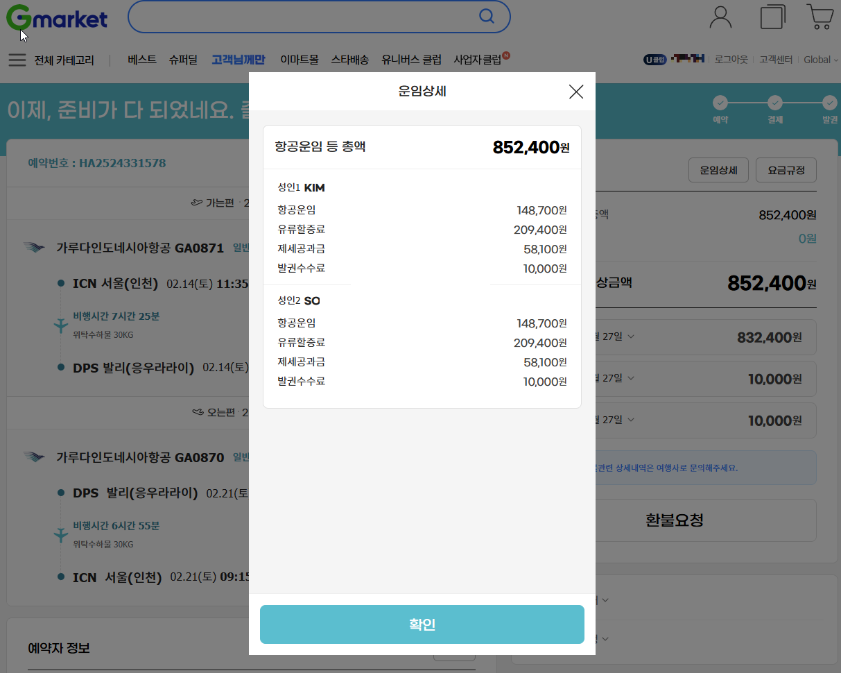 오고 가는 편 모두 깔끔한 직항으로 예약이 완료되었고 총금액은 852,400원입니다.