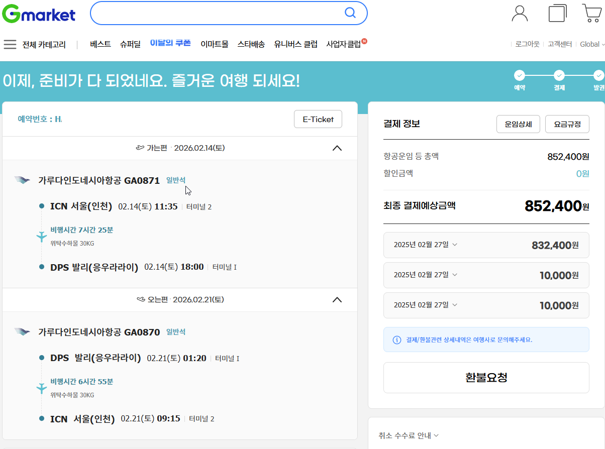 백문이 불여일견이죠. 제가 최종적으로 예약에 성공한 2026년 설 연휴, 발리 왕복 직항 항공권 내역입니다.
