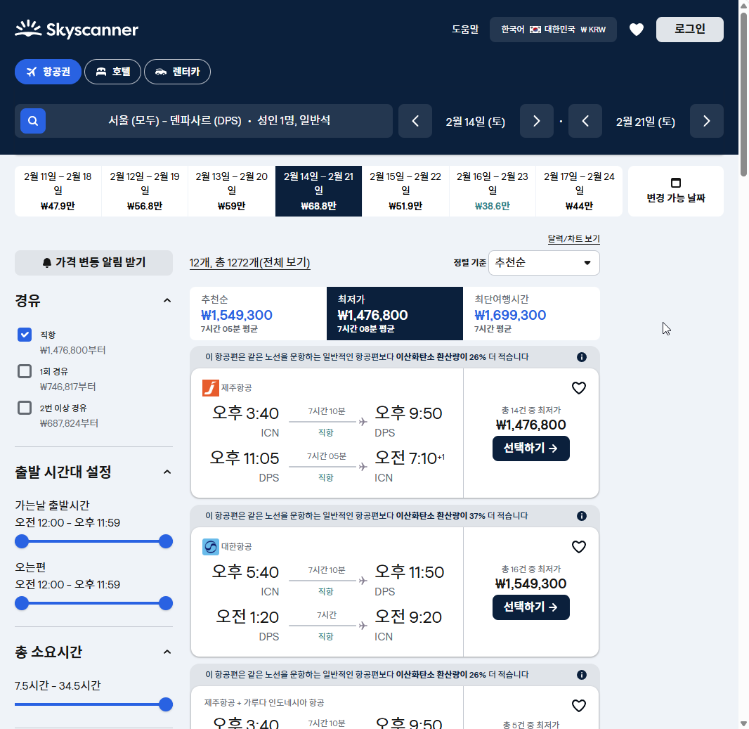 이 가격이 얼마나 저렴한지 체감하기 위해, 모두가 사용하는 스카이스캐너에서 동일한 일정으로 검색한 결과를 보여드리겠습니다.