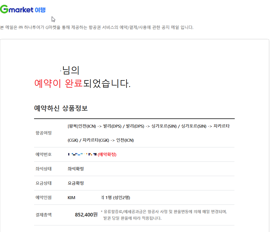 그렇다면 어떻게 이 가격이 가능했을까요? 사실 처음부터 직항편을 이 가격에 예약한 것은 아닙니다. 이 모든 전략의 시작은 아래의 '최초 예약 완료' 이메일에서부터 출발합니다.